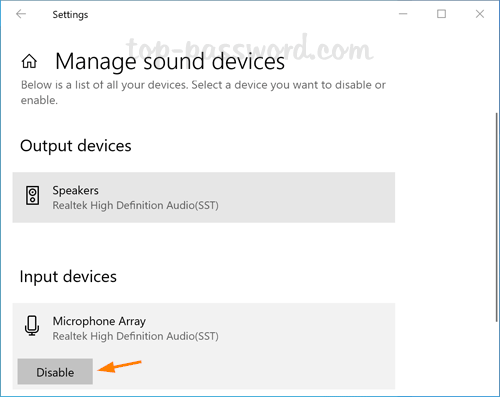 下輸入設備部分,選擇您的麥克風並單擊禁用。