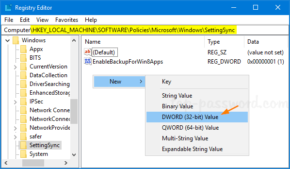 HKEY_LOCAL_MACHINE\SOFTWARE\Policies\Microsoft\Windows\SettingSync。右鍵單擊右側窗格中的空白區域,然後選擇新的->DWORD(32 位)值。