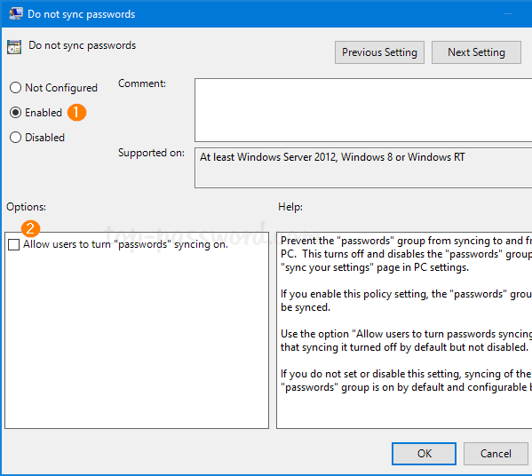 - 選擇啟用。取消選中“允許用戶打開密碼同步如果您還想禁用“設置”應用程序中的“密碼”同步設置,請選擇“選項”。