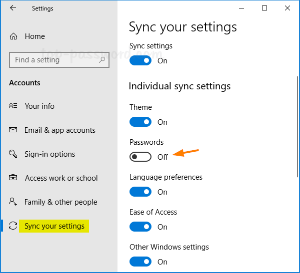 - 選擇同步您的設置在左側菜單中。您可以完全禁用同步,也可以有選擇地關閉各個同步設置。這裡我們選擇的是密碼選項將其關閉。