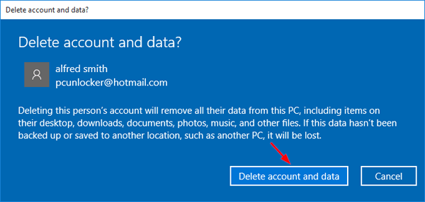 - 當出現確認對話框時,單擊“刪除帳戶和數據”按鈕用於刪除當前選擇的 Microsoft 帳戶。