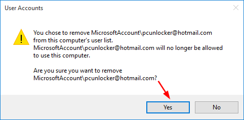 - 系統會提示您確認,如果您確實想繼續,請單擊是的並且 Microsoft 帳戶登錄信息將立即被刪除。