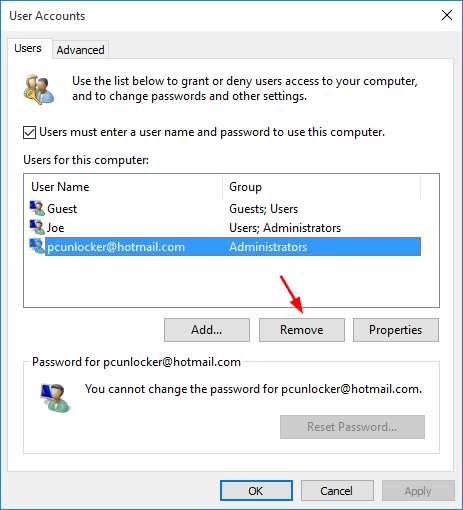 方法 2:從 Netplwiz 中刪除 Microsoft 帳戶登錄