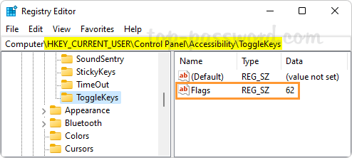 打開註冊表編輯器並導航至:HKEY_CURRENT_USER\Control Panel\Accessibility\ToggleKeys。雙擊字符串旗幟在右側窗格中。