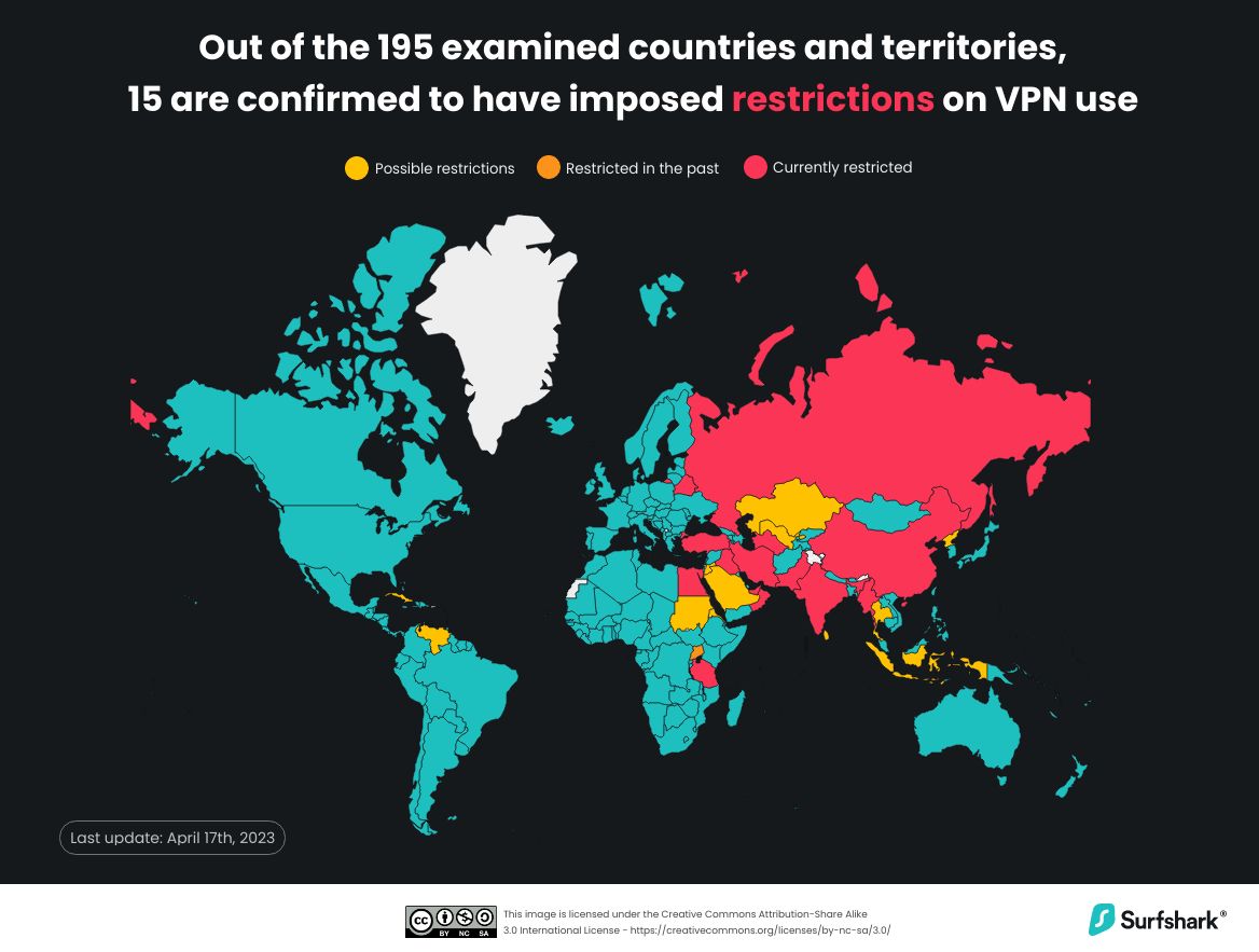 在19個不同的國家 /地區,VPN的使用受到限制(Surfshark,,,,top10vpn)