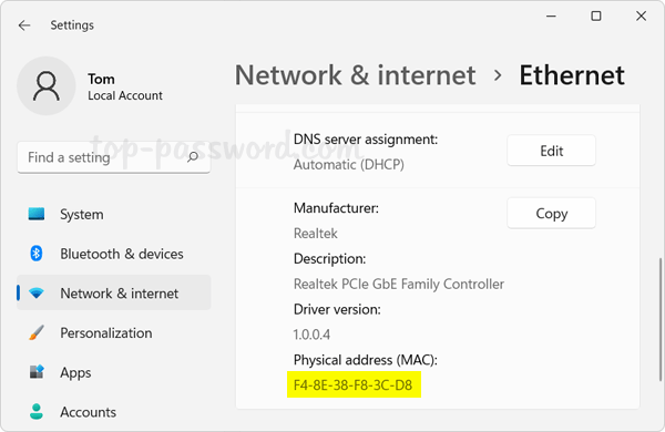 - 如果您點擊了以太網,向下滾動到下一個窗口的底部,您可以看到以太網適配器的 MAC 地址。