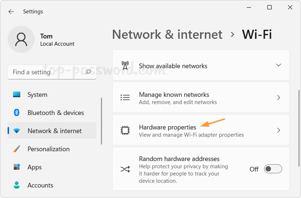 如果您點擊了無線上網相反,繼續單擊“硬件特性”選項,您還可以找到無線適配器的 MAC 地址。