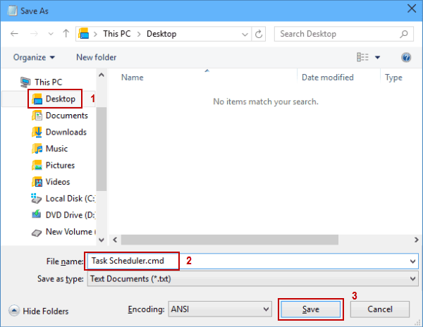 步驟2: 按Ctrl+S要保存文件,請選擇桌面, 類型任務計劃程序.cmd在文件名框中,然後點擊節省在“另存為”窗口中。