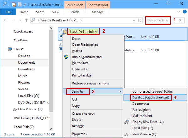 打開這台電腦, 類型任務調度程序(或安排任務)在右上角的搜索框中,右鍵點擊任務調度程序在結果中,單擊發送至在菜單上並選擇桌面(創建快捷方式)在子菜單中。現在任務計劃程序快捷方式已創建。您可以雙擊打開任務計劃程序。