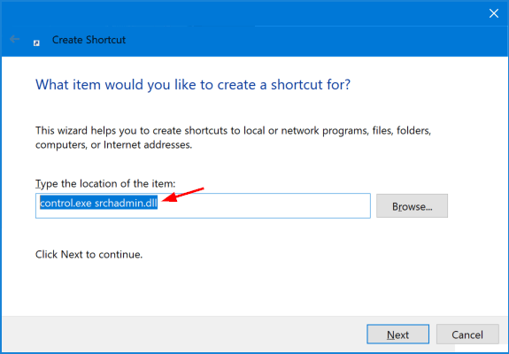 - 當創建快捷方式嚮導打開時,鍵入control.exe srchadmin.dll在位置框中,然後單擊下一個。