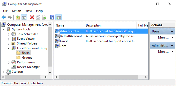 - 計算機管理控制台應該打開。擴張系統工具->本地用戶和組->用戶您將在右側窗格中看到本地用戶帳戶的列表。