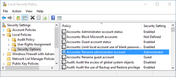 - 在右側窗格中,找到策略“帳戶:重命名管理員帳戶”,然後雙擊它以打開相應的策略設置。