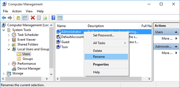 - 右鍵單擊要重命名的本地帳戶,然後選擇重命名從下拉上下文菜單中。