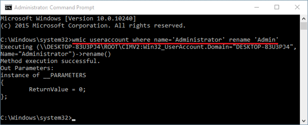 - 在命令提示符下,運行以下命令來重命名管理員帳戶,將 Admin 替換為您所需的名稱。