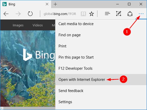 打開 Microsoft Edge 並導航到所需的網頁。單擊 Microsoft Edge 窗口右上角的三個點按鈕,然後選擇使用 Internet Explorer 打開。