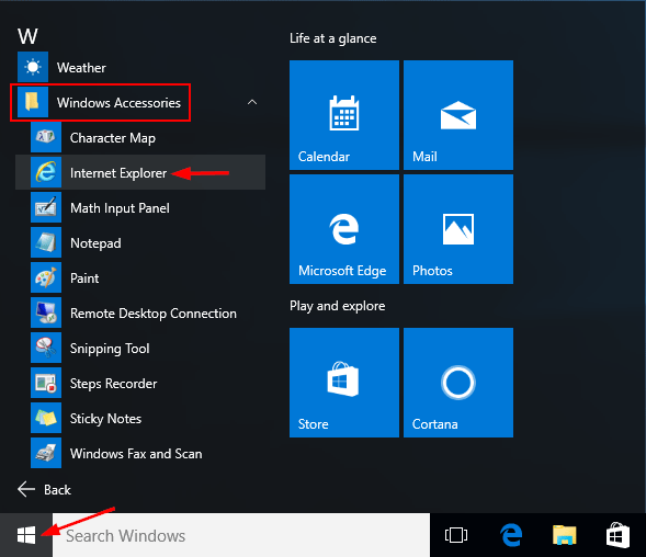 單擊任務欄上的 Cortana 搜索框,輸入互聯網瀏覽器並按 Enter 鍵。您可以從搜索結果訪問 Internet Explorer。