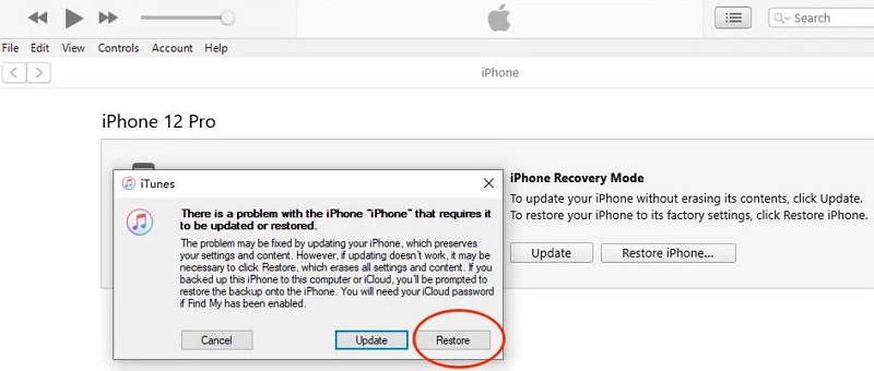 步驟4:打開iTunes/finder,並消息“ iPhone存在問題,必須進行更新或還原。”顯示。單擊“還原”。