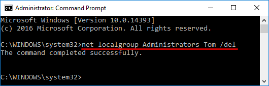- 要將管理員帳戶更改為標準用戶,只需將其從管理員組中刪除。鍵入此命令,然後按Enter。