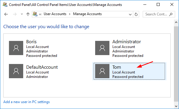 - 出現“管理帳戶”窗口,列出計算機上的所有帳戶。單擊您要更改的帳戶。