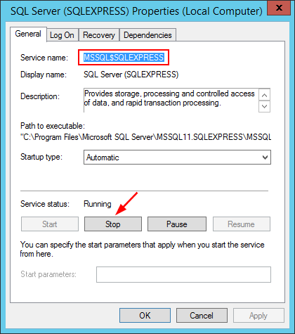 - 在“屬性”對話框中,您可以看到我的SQL Server實例的服務名稱是MSSQL$SQLEXPRESS。從那裡您可以單擊停止按鈕(如果您的 SQL Server 服務正在運行),或者單擊開始按鈕來啟動並運行服務。