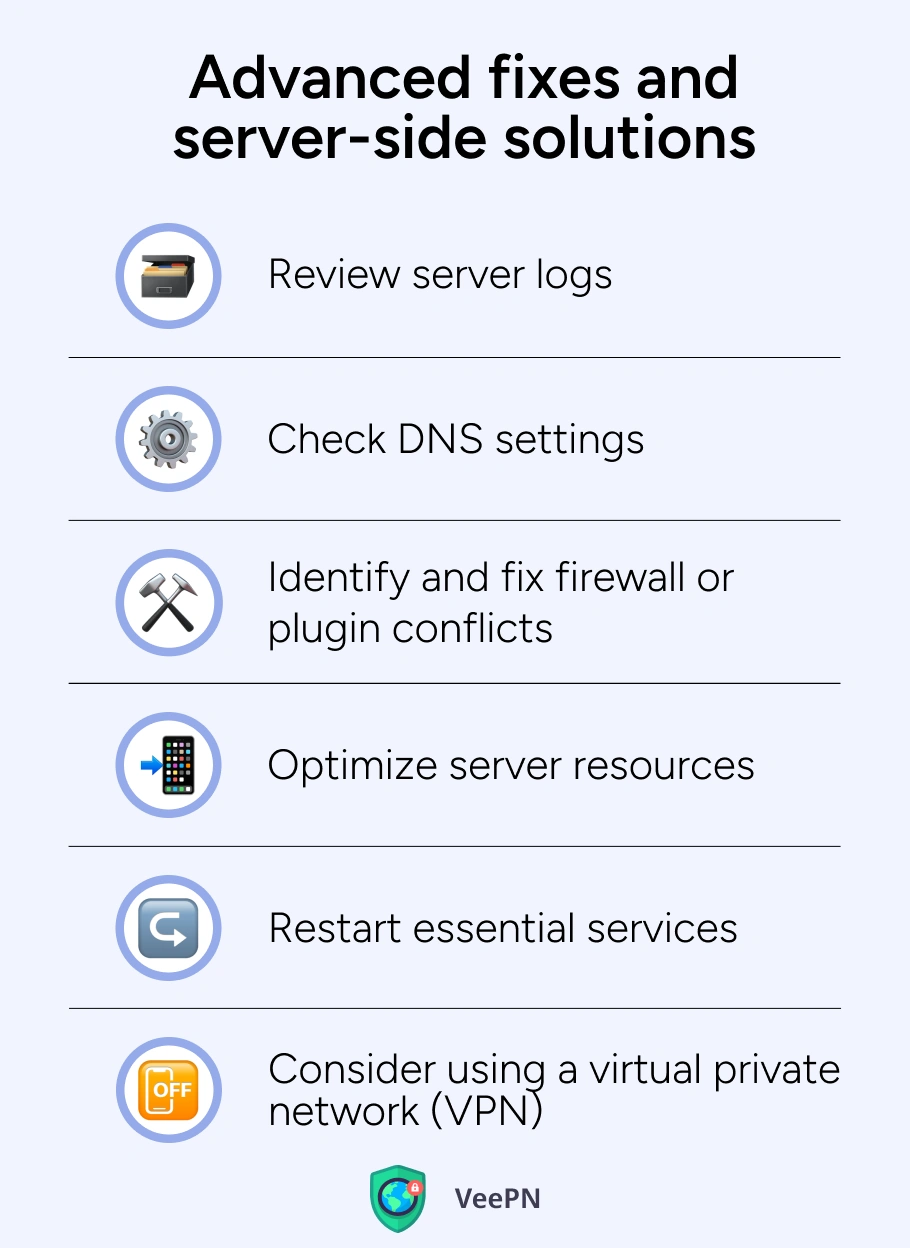 當基本方法失敗並且 502 壞網關問題仍然存在時,下一步應該是高級故障排除。服務器調整、網絡配置檢查以及深入的系統問題識別是您可能需要採取的高級步驟: