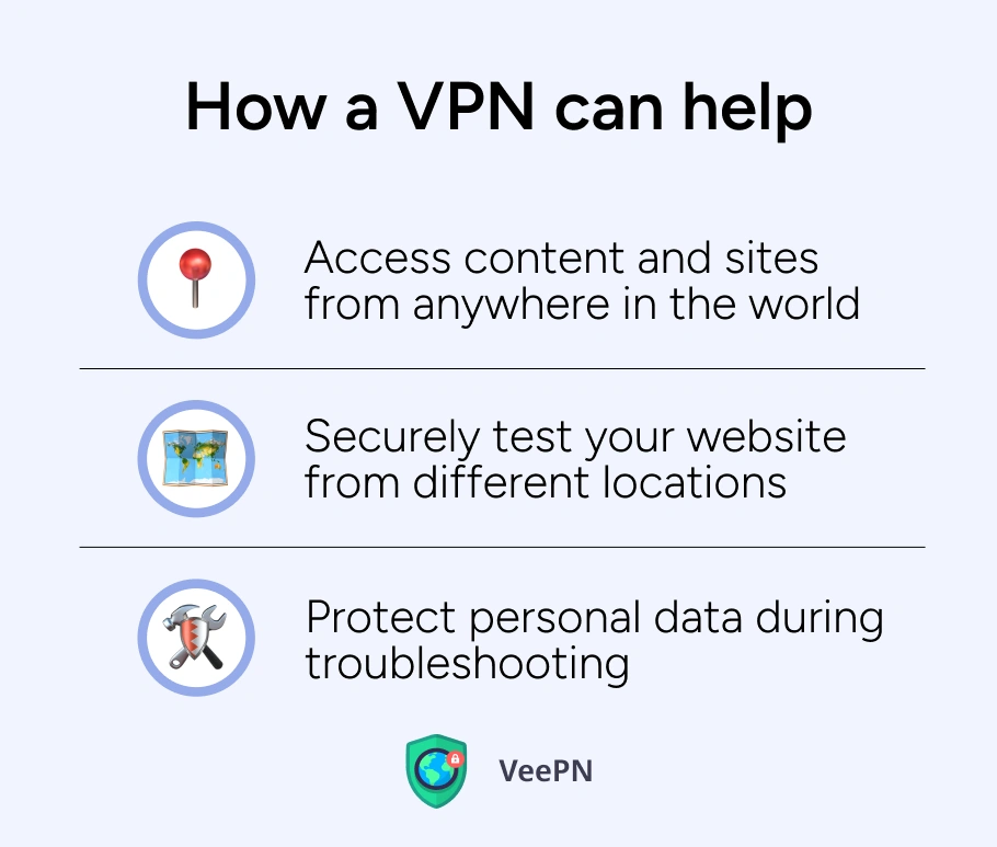 👍從不同位置安全地測試您的網站。VPN 使您能夠監控網站的性能,無論該網站是否跨不同服務器位置加載。通過這種方式,VPN 可以幫助您了解問題是否出在您這邊。
