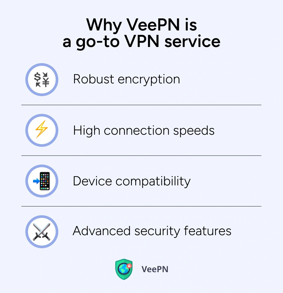 在在線安全、隱私和無縫瀏覽方面,VeePN 作為頂級 VPN 解決方案脫穎而出。憑藉強大的加密、高速連接、廣泛的設備兼容性和高級安全功能的組合,VeePN 確保用戶可以在最大程度的保護和便利下在線瀏覽、流式傳輸和通信: