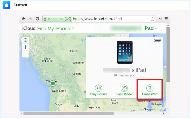 如果您在鎖定屏幕上沒有計算機和擦除iPad按鈕,則可以嘗試在iCloud或其他iPhone等iOS設備上解鎖iPad密碼。去使用查找我的功能以找到iPad,然後刪除它。這樣,您被遺忘的密碼將被刪除,iPad應解鎖。