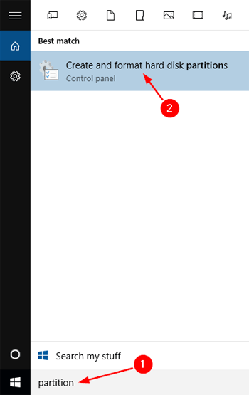 - 類型分割在搜索框中。顯示搜索結果後,單擊創建並格式化硬盤分區。