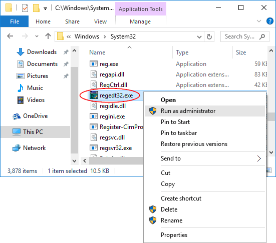 找到regedt32.exe文件。右鍵單擊它並選擇以管理員身份運行。