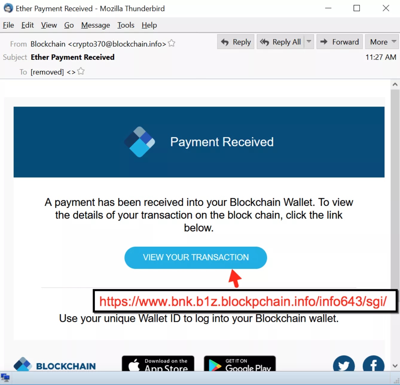 下面的示例是一封乍一看可能看起來合法的電子郵件。它告訴您,您的區塊鏈錢包已收到加密貨幣付款。此外,它還提供了一個查看“交易”的鏈接。但如果好奇心讓您想查看到底發生了什麼,您就會落入網絡釣魚的陷阱。
