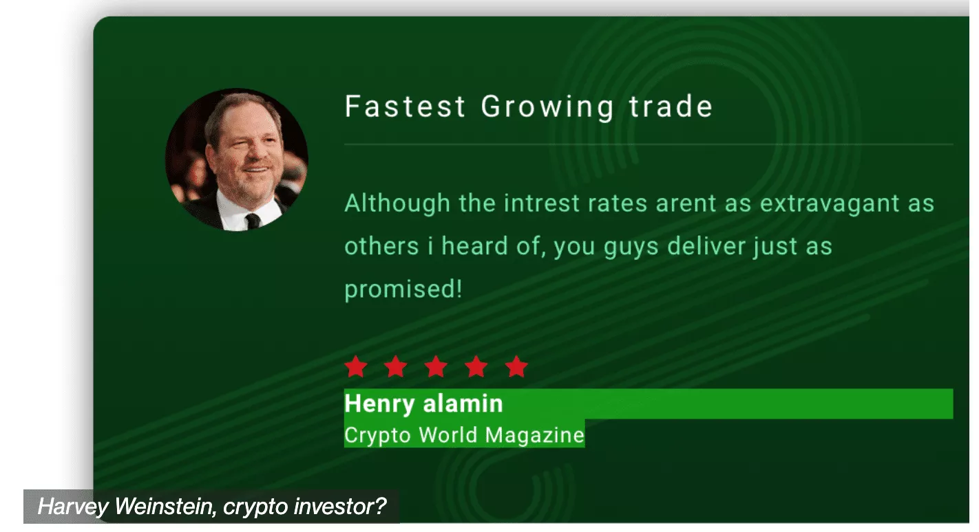 另外,請務必注意潛在惡意網站上的評論。看看下面的例子。臭名昭著的電影製片人哈維·韋恩斯坦突然變成了“加密貨幣投資者”亨利·阿拉明,提供了“誠實的評論”。