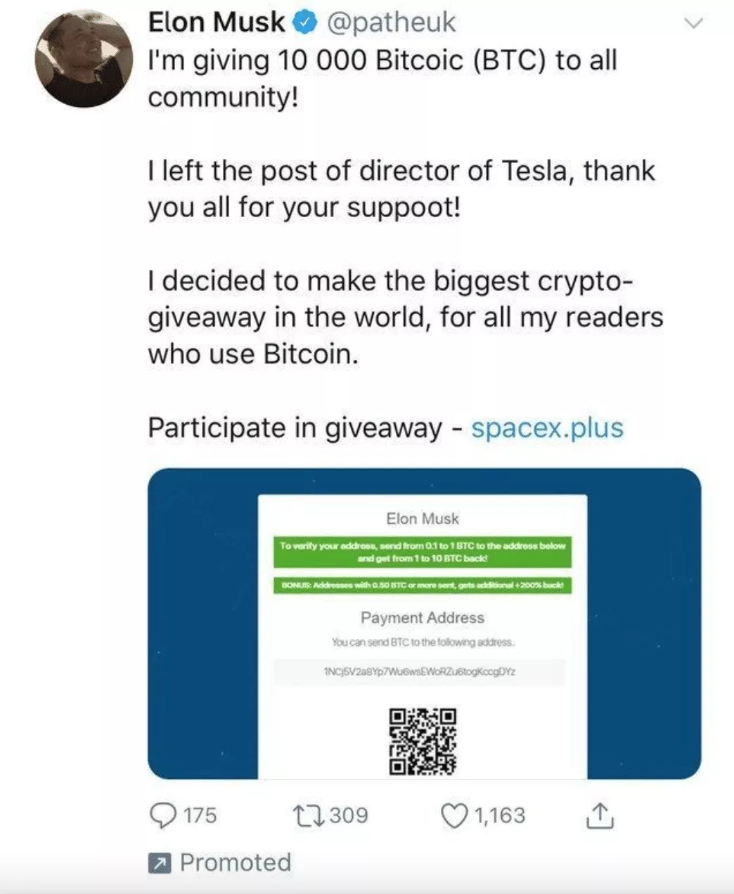 埃隆·馬斯克(Elon Musk)捐贈一萬比特幣並想與感興趣的人分享?不,這不是慷慨的贈品,而是您可能在 Twitter、YouTube 和 Instagram 等社交媒體上遇到的騙局。一旦您點擊鏈接並確認您想要參與,他們會要求您進行驗證付款。而且,當您將比特幣發送到所提供的區塊鏈地址時,您將一無所有。