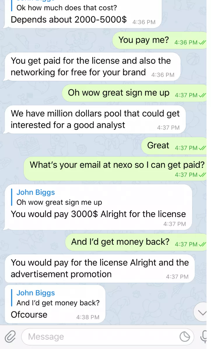 以下是常見冒名頂替騙局的示例。一個人冒充一家有前途的加密貨幣相關公司的高級管理人員,鼓勵潛在的欺詐受害者投資一個項目以獲得“許可證”。