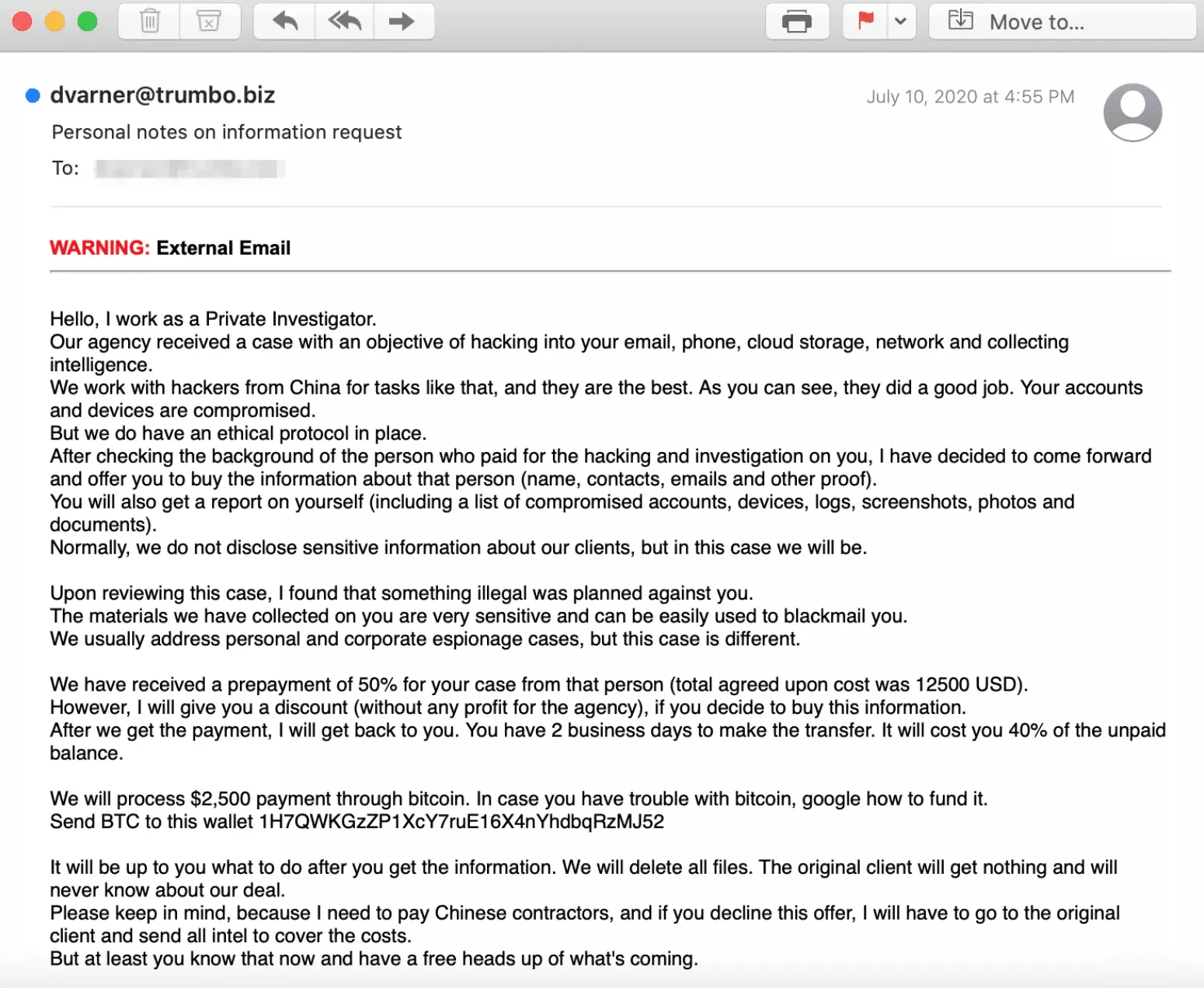 勒索和勒索是最殘酷的,可悲的是,也是非常常見的比特幣詐騙。此類欺詐通常涉及發件人聲稱知道您的密碼或其他機密信息的電子郵件。然後,他們威脅受害者披露這些數據或將其轉移到某個神秘的“客戶”手中。當然,如果你向他們發送一定數量的加密貨幣,他們也承諾不會這樣做。這是此類電子郵件的示例。