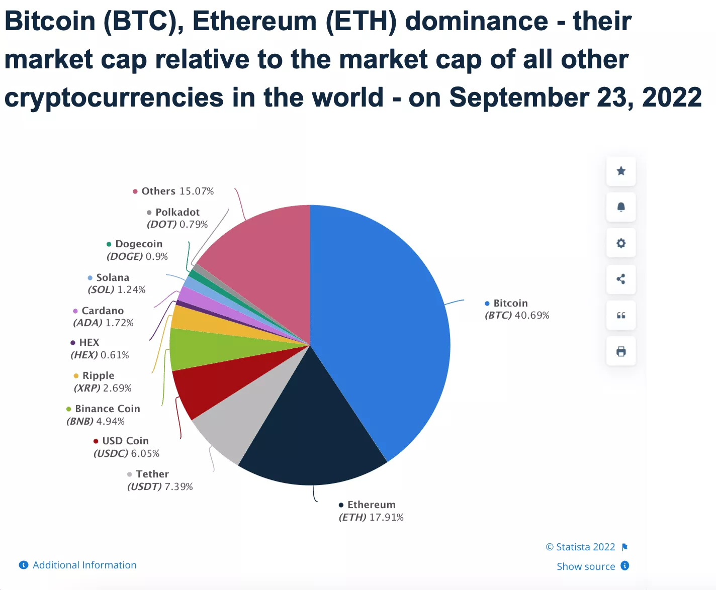 需要證明嗎?幹得好。 2022年第一季度,加密貨幣欺詐損失近3.3億美元。相比之下,2020 年的總損失為 1.3 億美元,2021 年的總損失為 6.8 億美元。此外,其中 70% 的詐騙針對的是比特幣。這並不奇怪。斯塔斯塔報告比特幣仍然主導著加密世界,市值超過 40%。