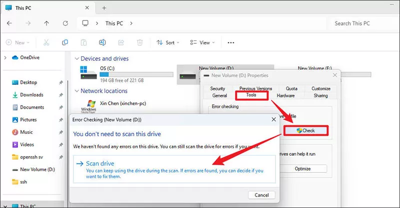 2. 在驅動器的“屬性”對話框中,選擇“工具”選項卡,然後單擊“錯誤檢查”下的“檢查”按鈕。