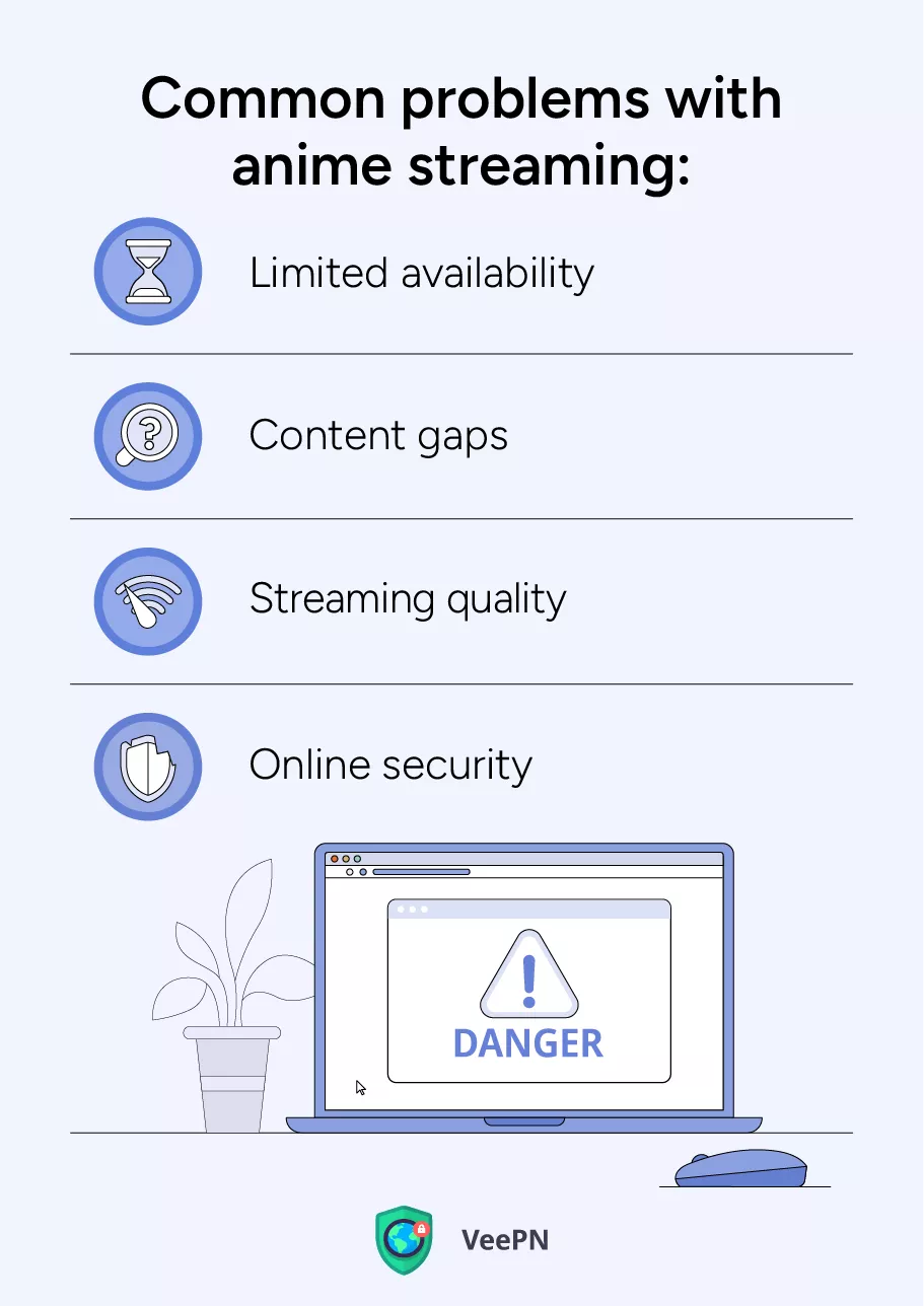 - 在線安全。動漫網站,尤其是免費的動漫網站,可能包含對您的互聯網隱私的各種威脅,例如網絡釣魚鏈接、惡意軟件、彈出廣告等。這樣,在線觀看動漫幾乎總是會給您的個人信息和設備的健康帶來嚴重的風險。