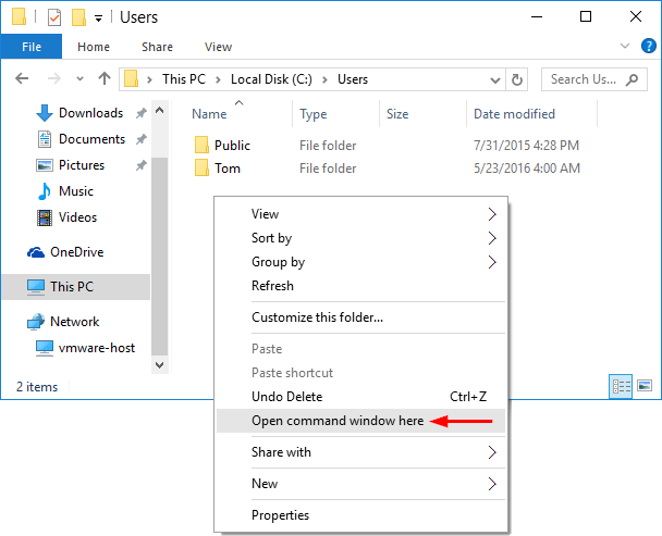 - 打開命令提示符— 使用標準權限在當前選定的文件夾中打開命令提示符。