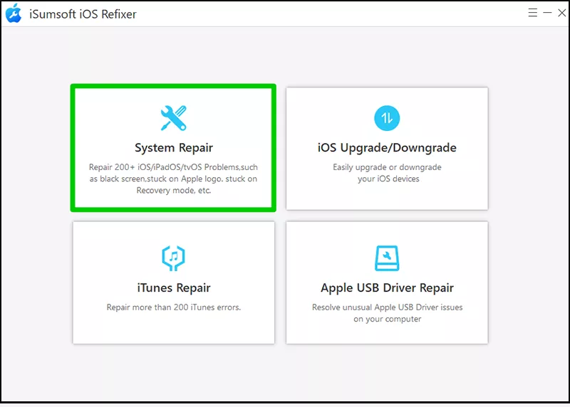 3. 在 iSoft iOS Refixer 中,選擇“系統修復”,然後在下一頁選擇“標準模式”。