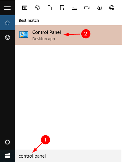 單擊任務欄上“開始”按鈕附近的 Cortana 搜索欄。類型控制面板並按 Enter 鍵。