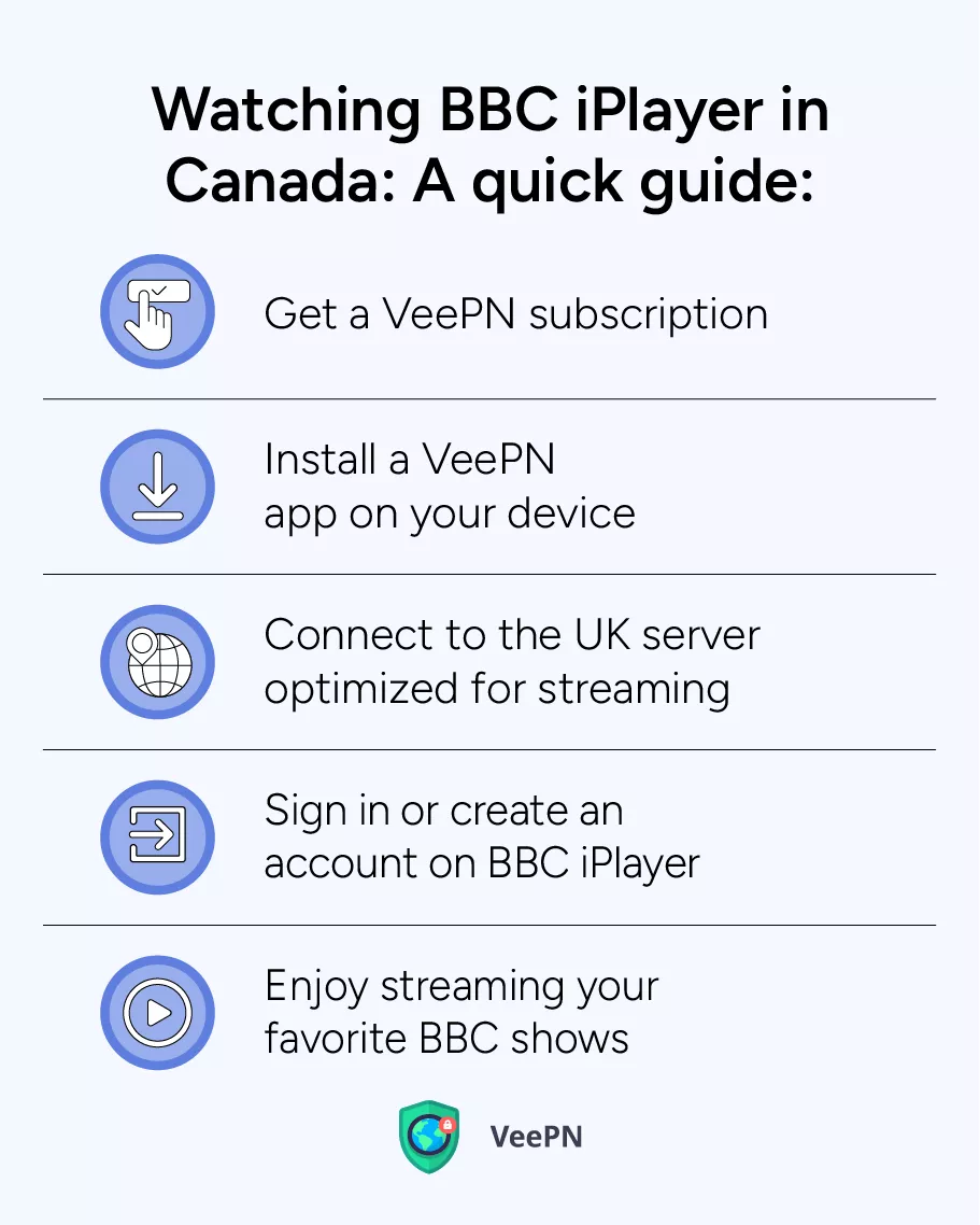 要在前往加拿大旅行時訪問BBC iPlayer,您可以使用Veepn(一種優質VPN服務,可提供位於英國的流媒體優化服務器。通過通過VEEPN連接到英國服務器,您的互聯網流量似乎來自英國,使您可以訪問BBC iPlayer,就好像您在家一樣。