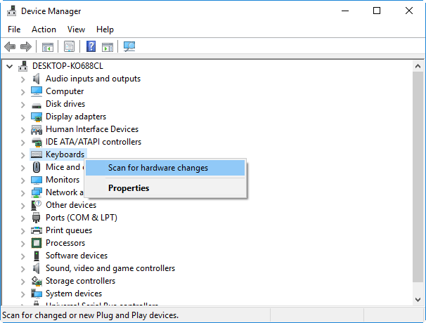 5. 筆記本電腦重新啟動後,檢查驅動程序是否自動安裝。如果沒有,請再次打開設備管理器,然後右鍵單擊鍵盤並選擇掃描硬件更改安裝它。安裝驅動程序後,鍵盤應該可以正常工作。