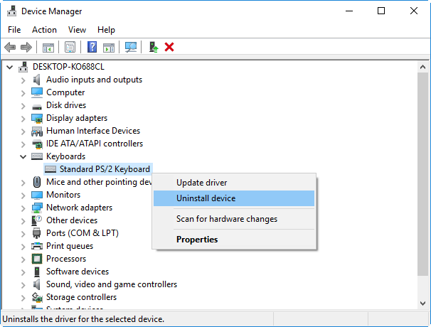 3. 然後您將在鍵盤下看到筆記本電腦的鍵盤。通常,它是 PS/2 鍵盤。右鍵單擊鍵盤並選擇卸載。如果您不確定筆記本電腦的鍵盤是哪一個,您可以卸載所有鍵盤。
