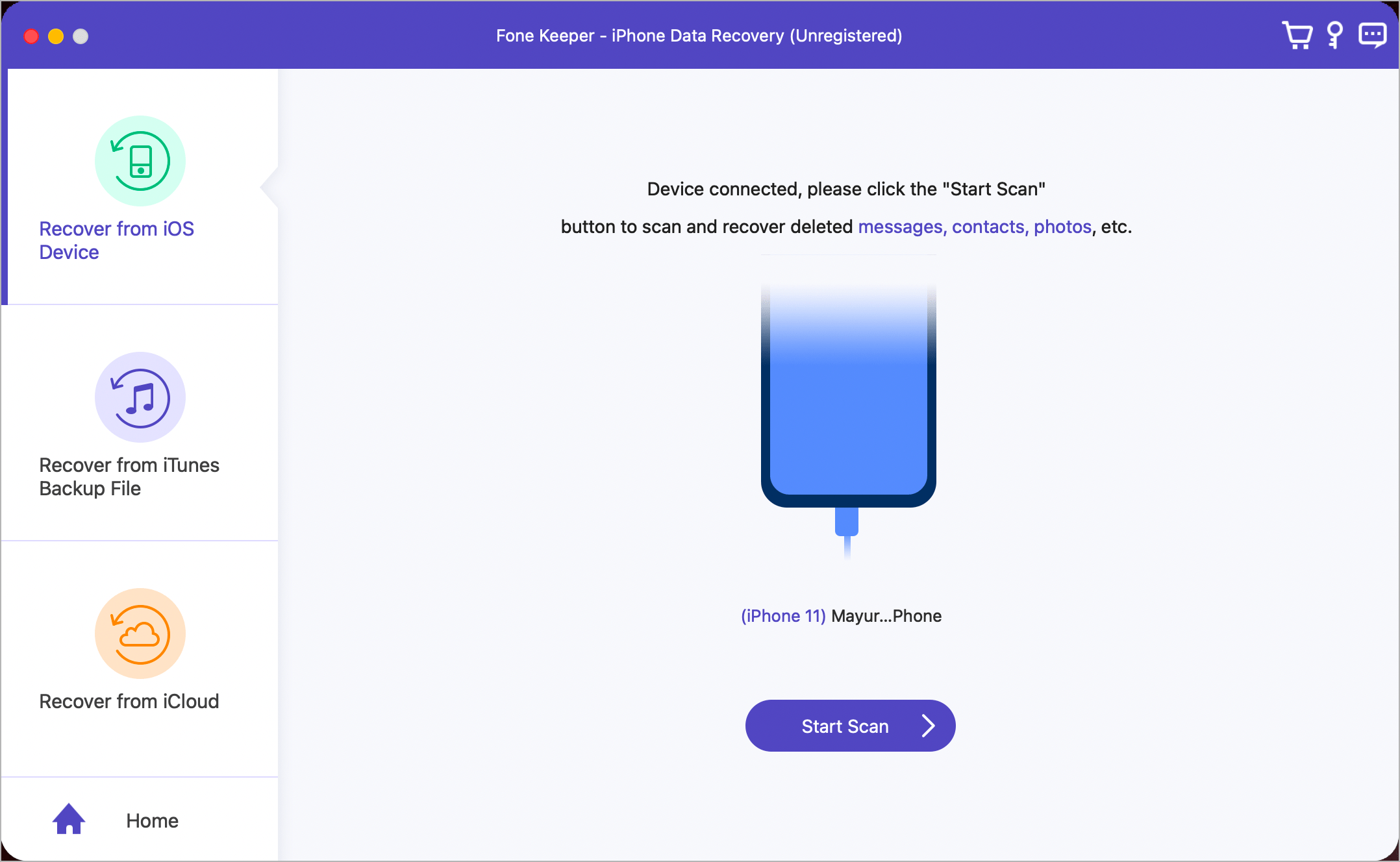 您是否不小心從 iOS 設備中刪除了某些內容?嗯,首先要檢查的是回收站。如果該文件不存在,則除了 Fone Keeper 之外您別無選擇。幸運的是,它可以幫助您恢復從 iOS 設備中意外刪除的所有文件,而您在 iPhone 或 iTunes 軟件上找不到任何恢復這些文件的選項。使用Fone Keeper,您可以簡單地完成使用過程,當您要掃描設備時,選中已刪除文件的複選框,您將能夠立即快速恢復這些文件。