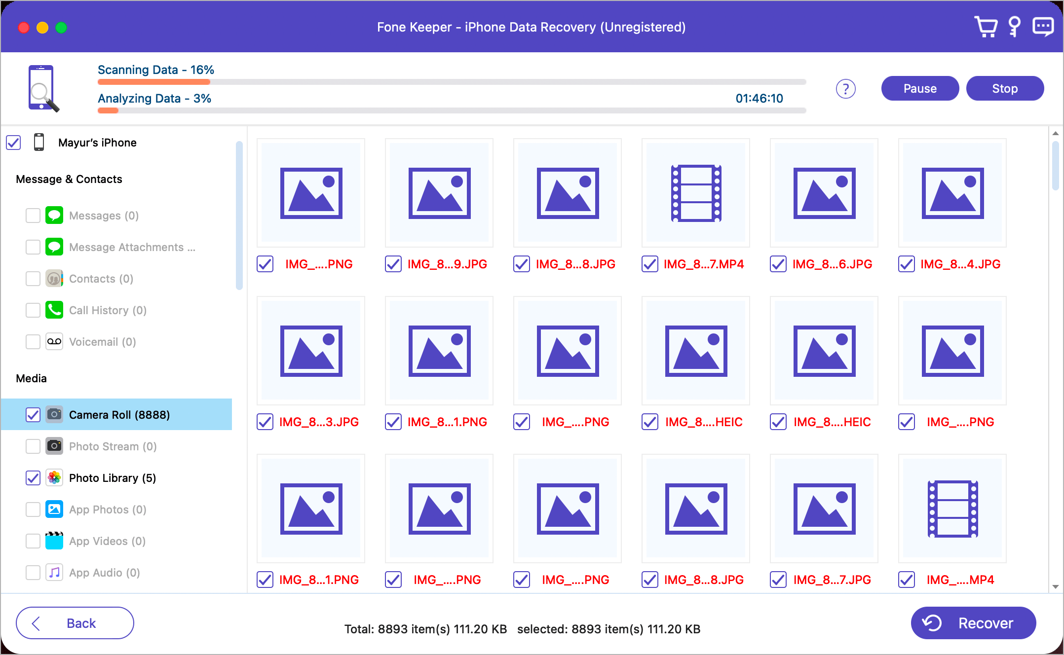 如今最新的 iPhone 具有防水功能,但並不防水,而舊型號的 iOS 設備則根本不防水。因此,您無需擔心您的 iOS 設備是否因進水而丟失某些數據。 Fone Keeper 可幫助您恢復因水損壞而丟失的數據。當您使用此軟件掃描設備時,它會自動顯示您在設備上找不到的所有文件。