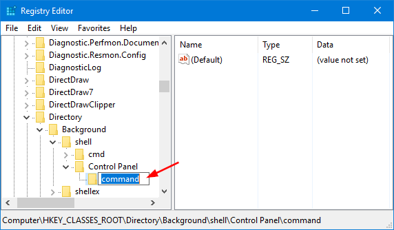 - 接下來,右鍵單擊新創建的“控制面板” 鍵並選擇新的->鑰匙。命名密鑰命令。
