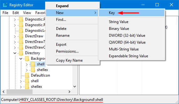 - 右鍵單擊殼鍵入左側邊欄中的 ,然後選擇新的->鑰匙。