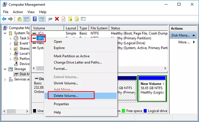 第三步:選擇D盤,右鍵單擊刪除卷。