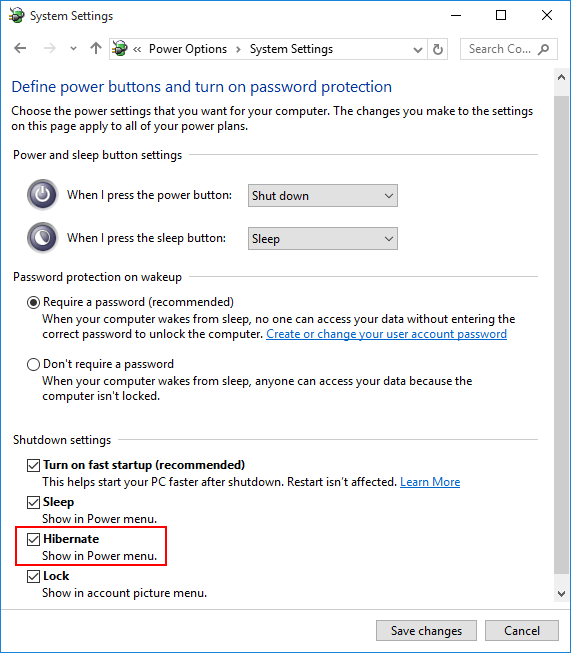- 滾動到窗口底部,直到找到“關機設置”部分。現在檢查休眠複選框並單擊保存更改。